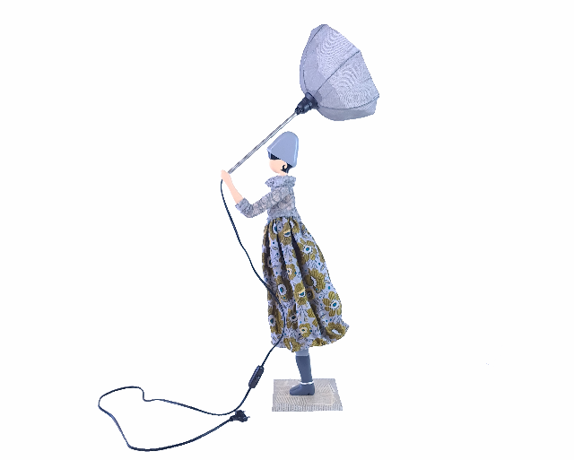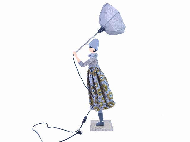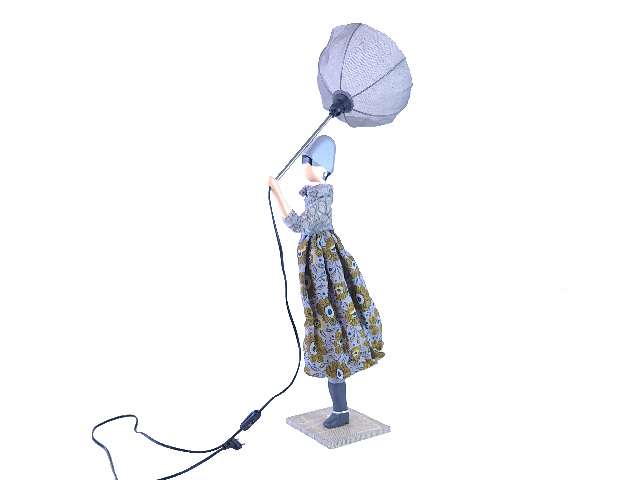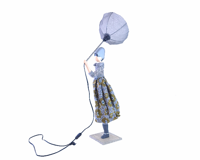 Tischlampe in Form einer Dame, die zu ihrem Kleidchen und Jäckchen einen farblich abgestimmten geöffneten Sonnen-/Regen-Schirm trägt. Die Figur stellt den Lampenfuß dar, der Sonnen-/Regenschirm den Lampenschirm. Holzsockel mit eingefasstem Zeitungspapier. In Handarbeit gefertigt.