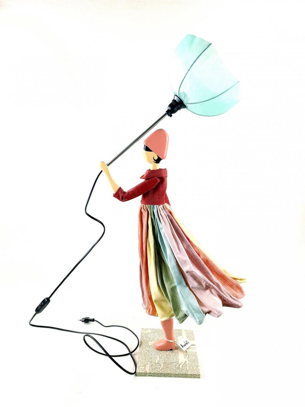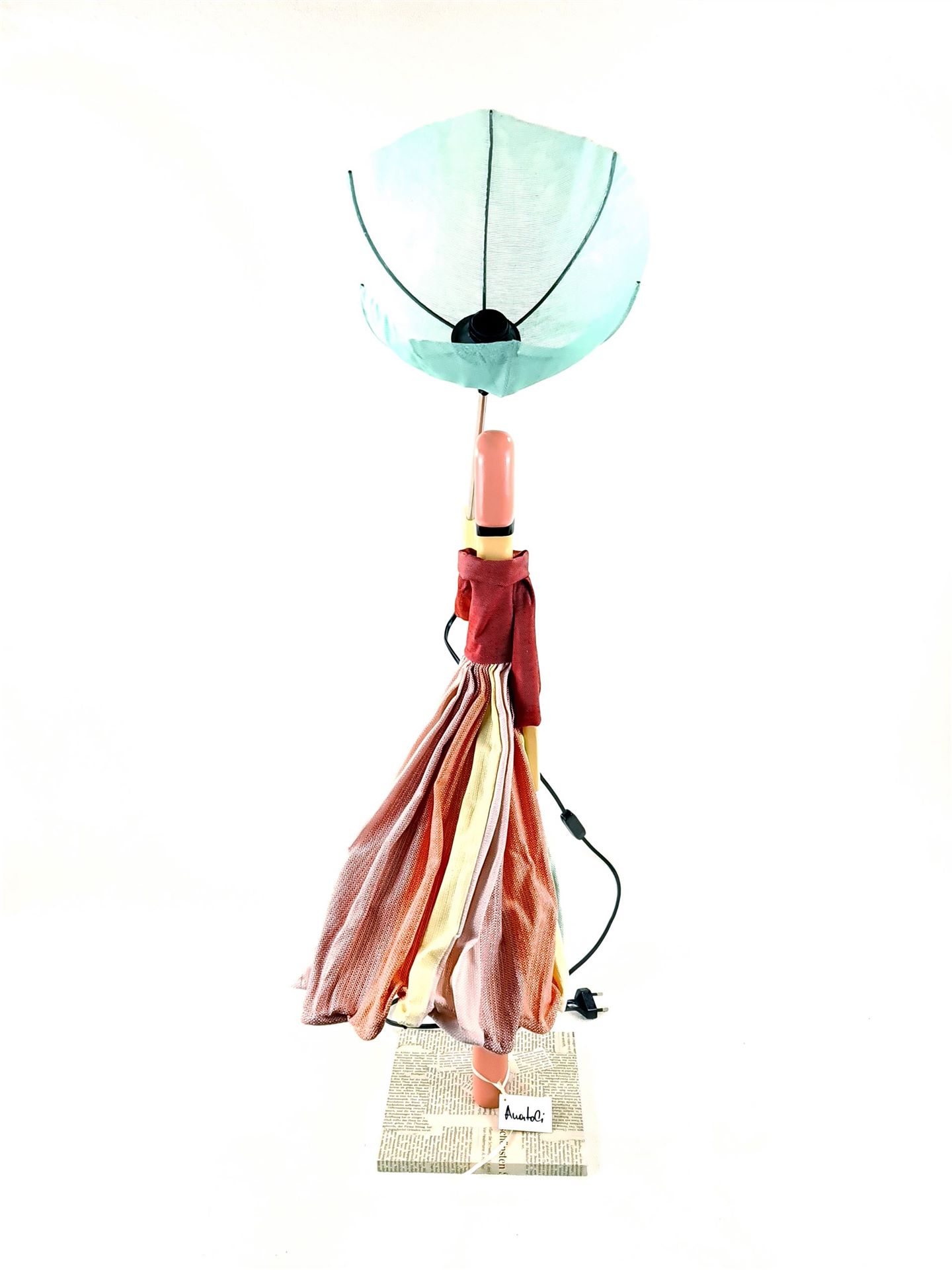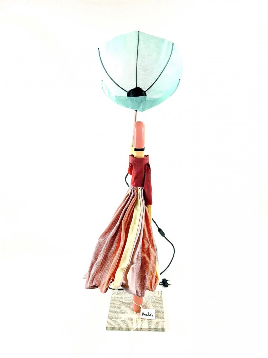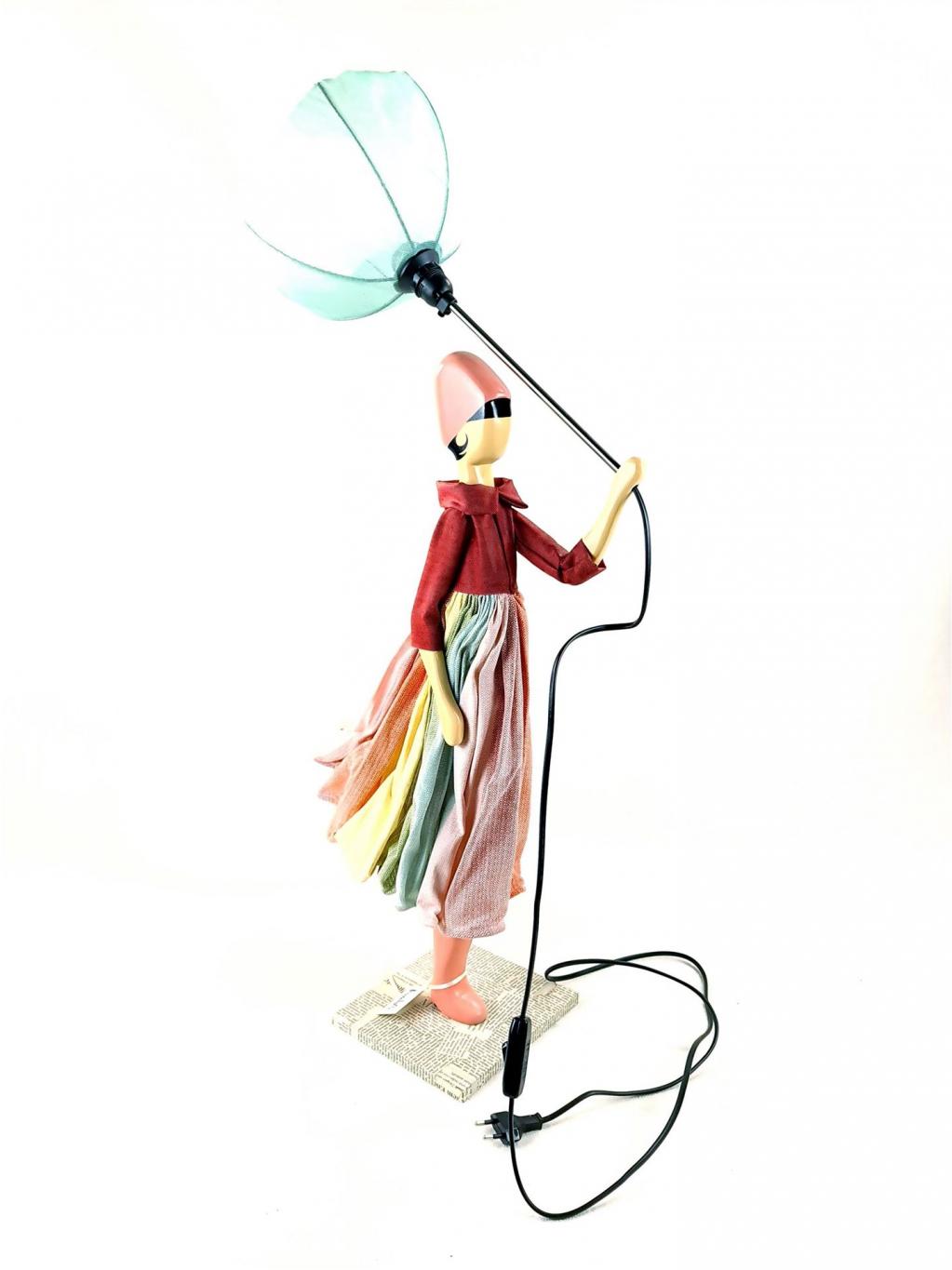 Tischlampe in Form einer Dame, die zu ihrem Kleidchen einen farblich abgestimmten geöffneten Sonnen-/Regen-Schirm trägt. Die Figur stellt den Lampenfuß dar, der Sonnen-/Regenschirm den Lampenschirm. Holzsockel mit eingefasstem Zeitungspapier. In Handarbeit gefertigt.