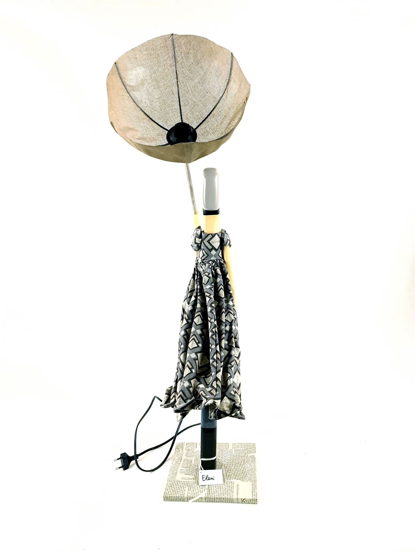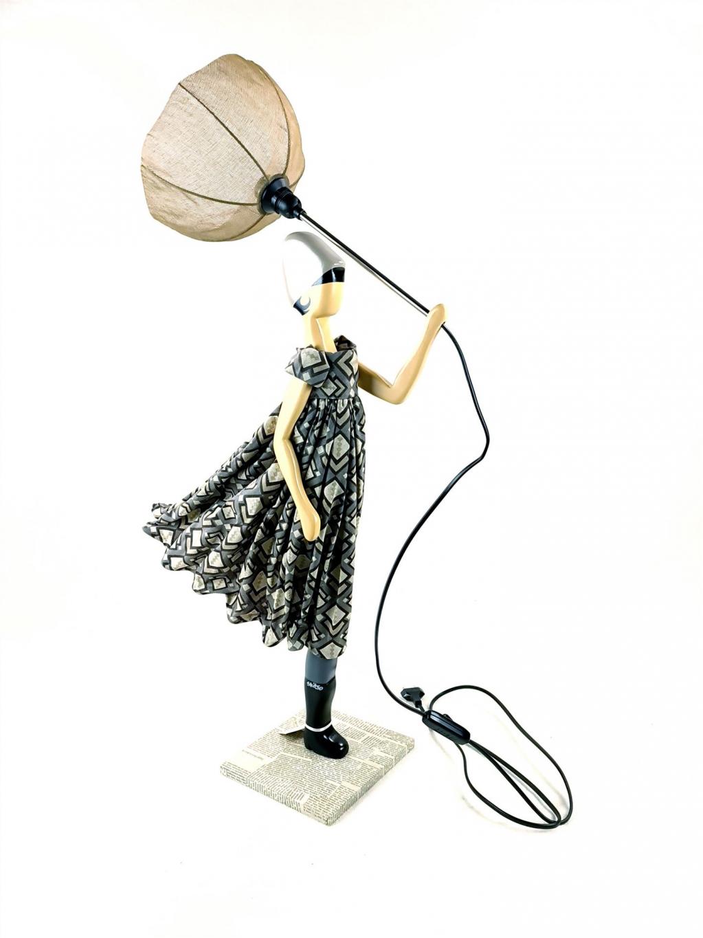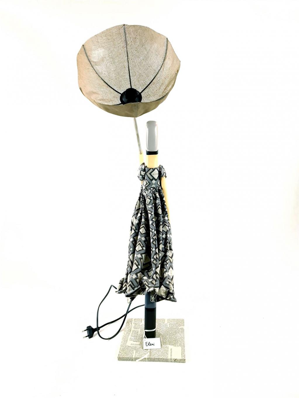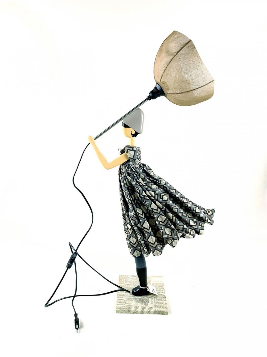 Tischlampe in Form einer Dame, die zu ihrem Kleidchen einen farblich abgestimmten geöffneten Sonnen-/Regen-Schirm trägt. Die Figur stellt den Lampenfuß dar, der Sonnen-/Regenschirm den Lampenschirm. Holzsockel mit eingefasstem Zeitungspapier. In Handarbeit gefertigt.
