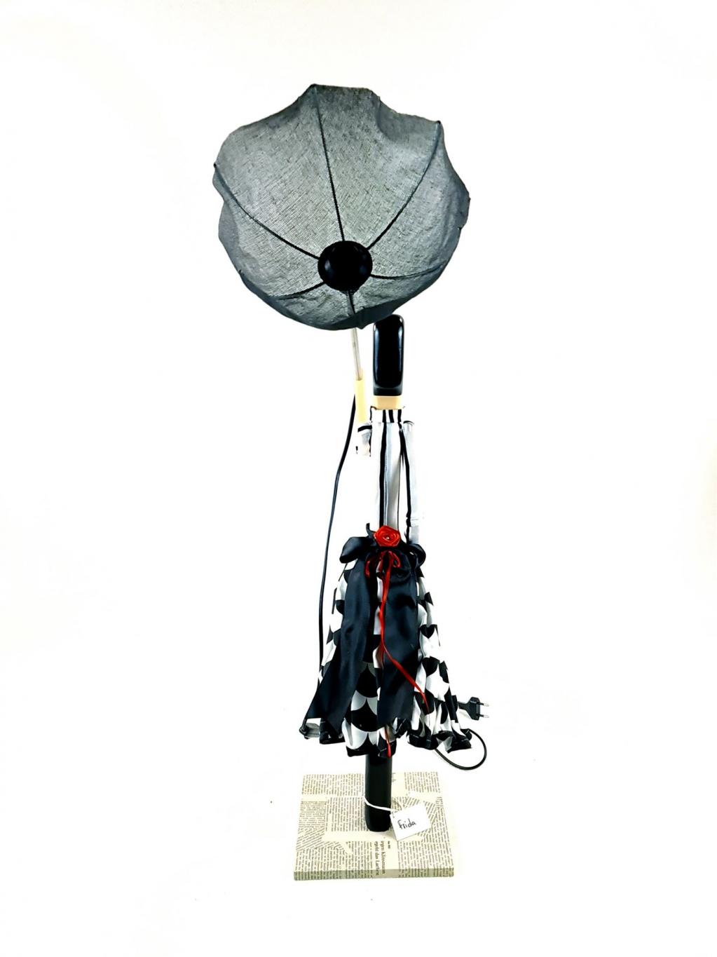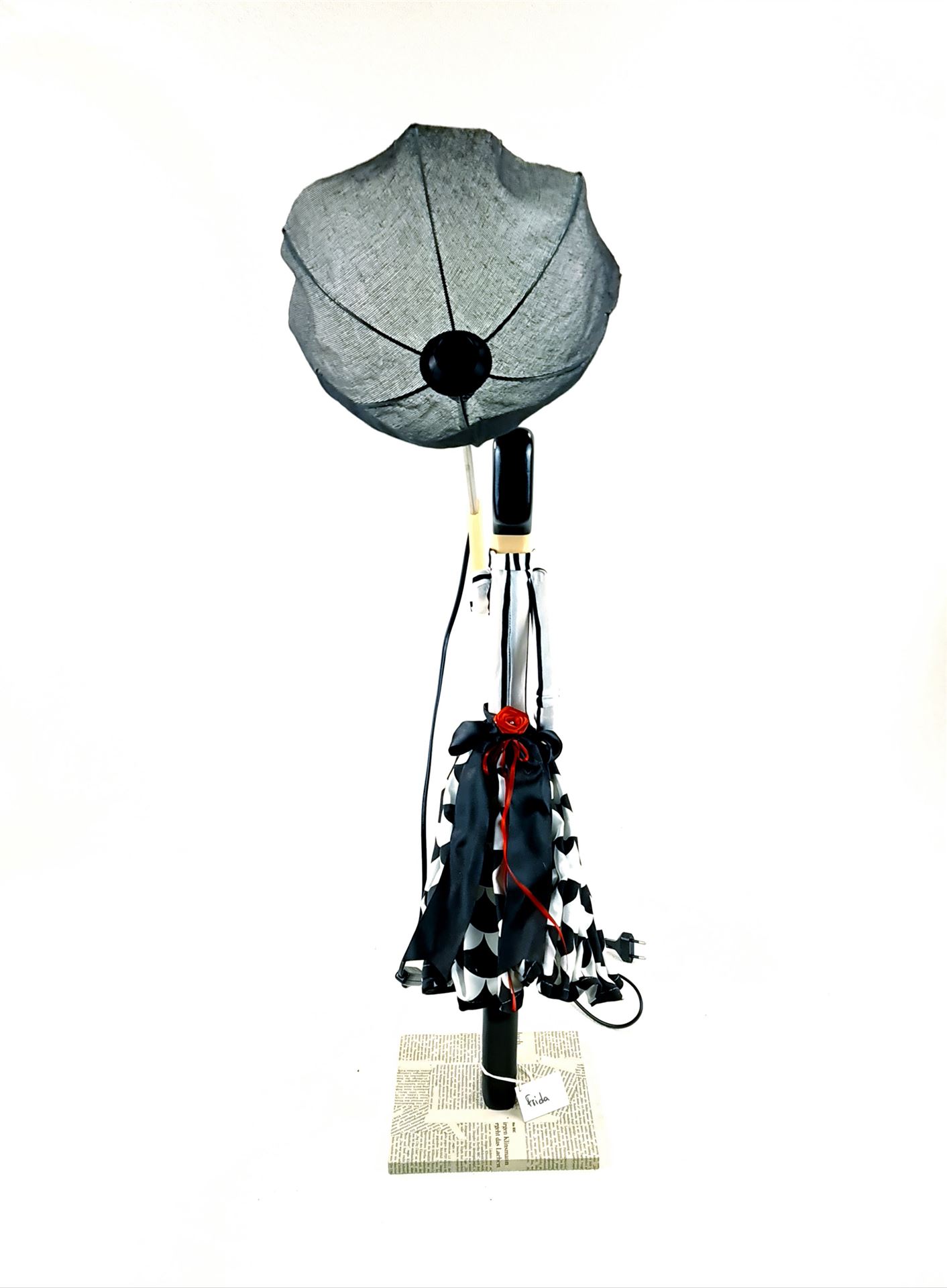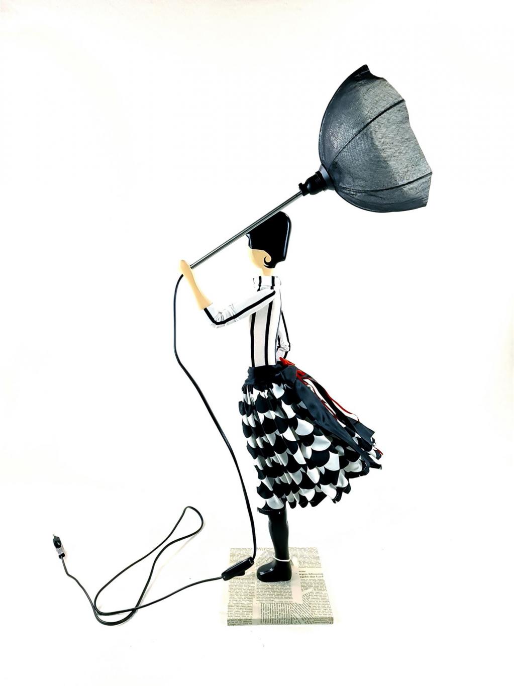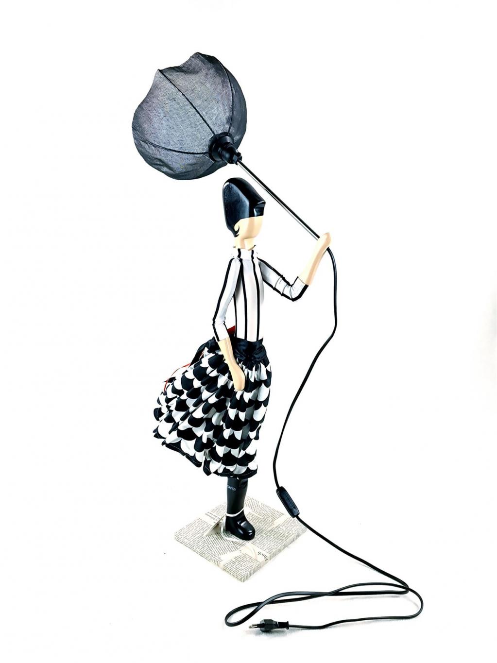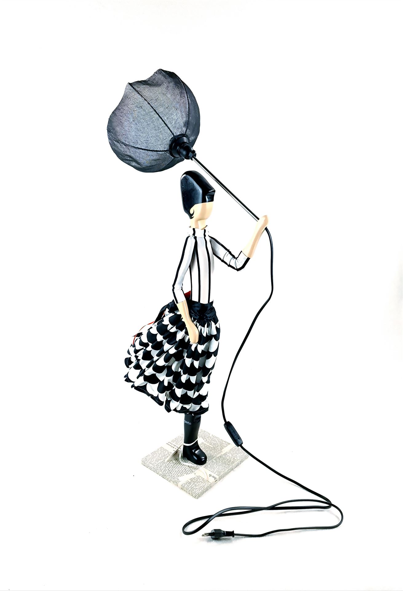Tischlampe in Form einer Dame, die zu ihrem Kleidchen einen farblich abgestimmten geöffneten Sonnen-/Regen-Schirm trägt. Die Figur stellt den Lampenfuß dar, der Sonnen-/Regenschirm den Lampenschirm. Holzsockel mit eingefasstem Zeitungspapier. In Handarbeit gefertigt.