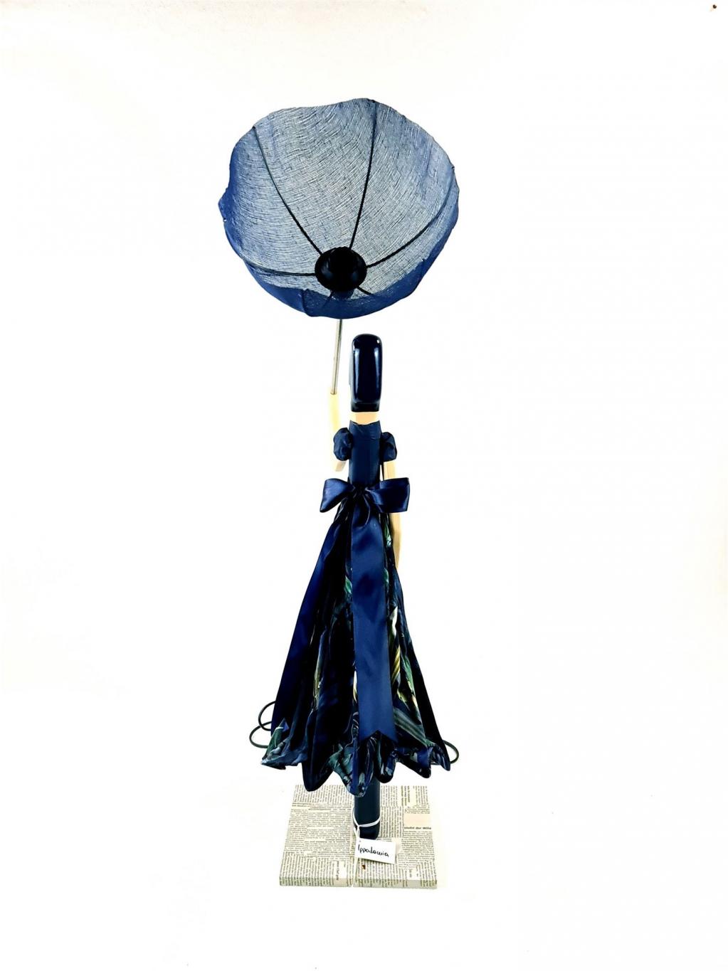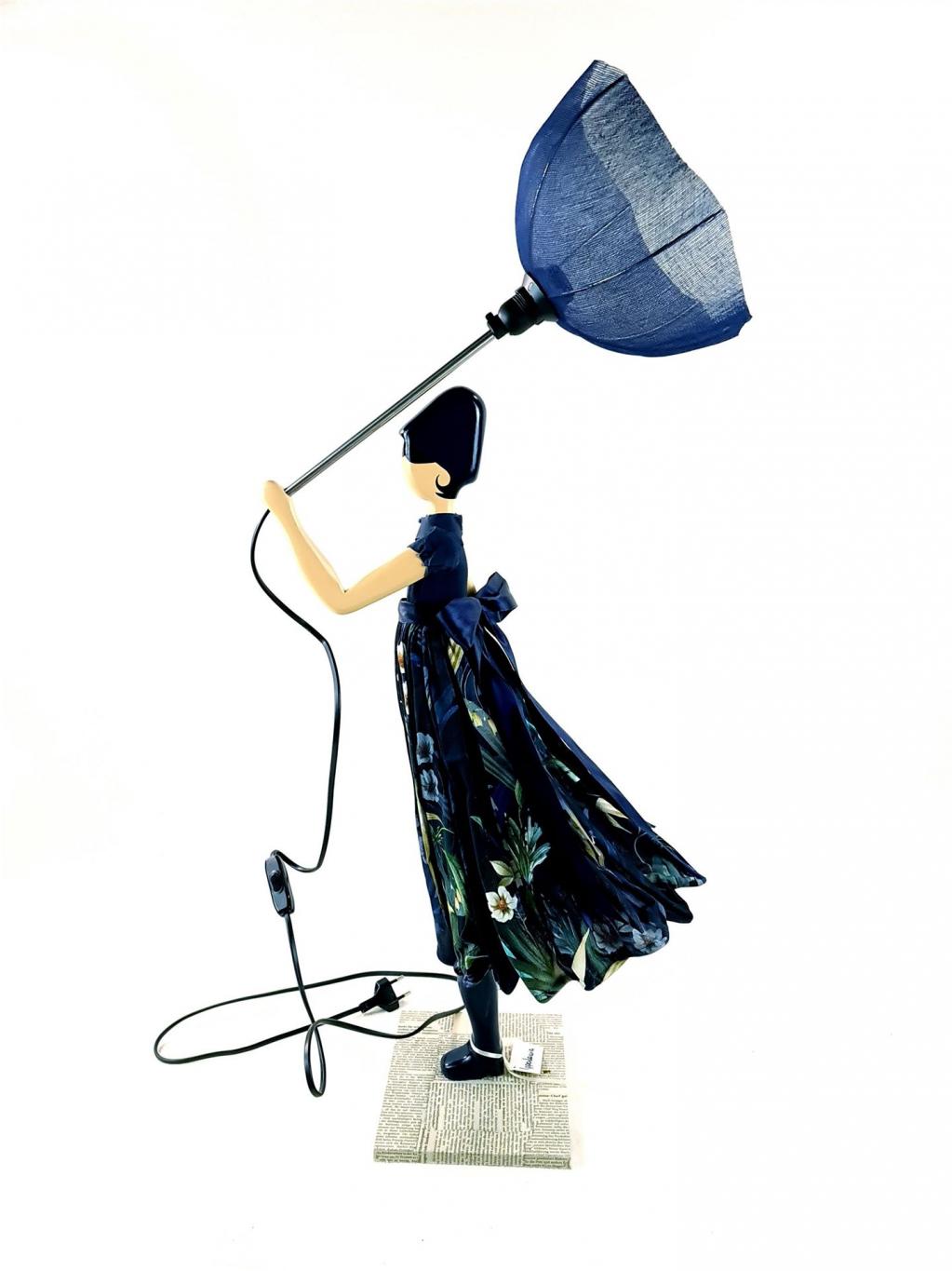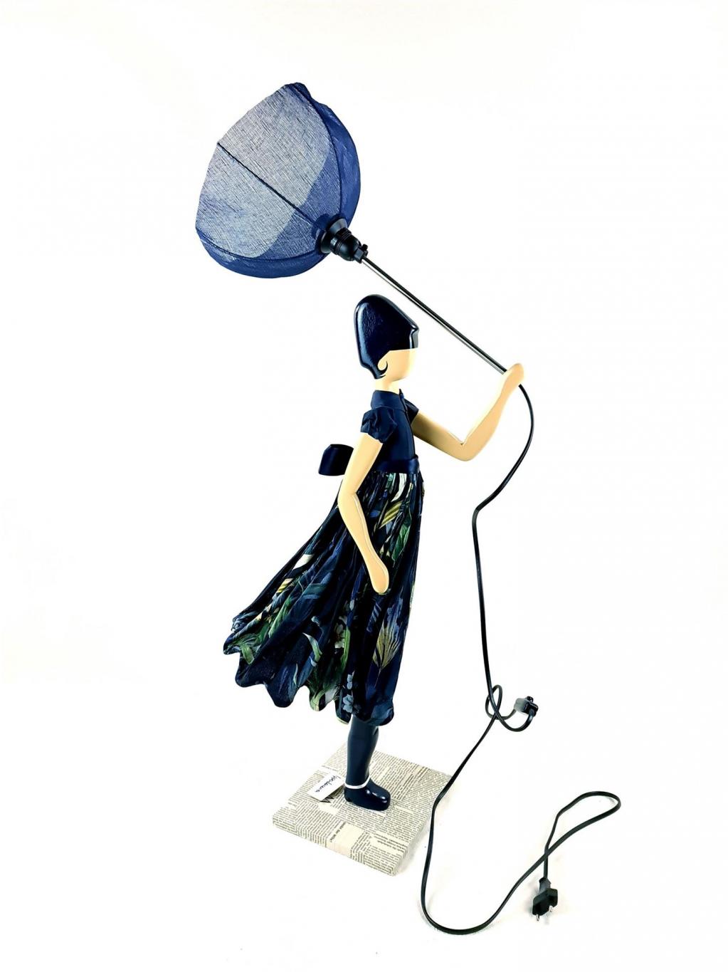 Tischlampe in Form einer Dame, die zu ihrem Kleidchen einen farblich abgestimmten geöffneten Sonnen-/Regen-Schirm trägt. Die Figur stellt den Lampenfuß dar, der Sonnen-/Regenschirm den Lampenschirm. Holzsockel mit eingefasstem Zeitungspapier. In Handarbeit gefertigt.