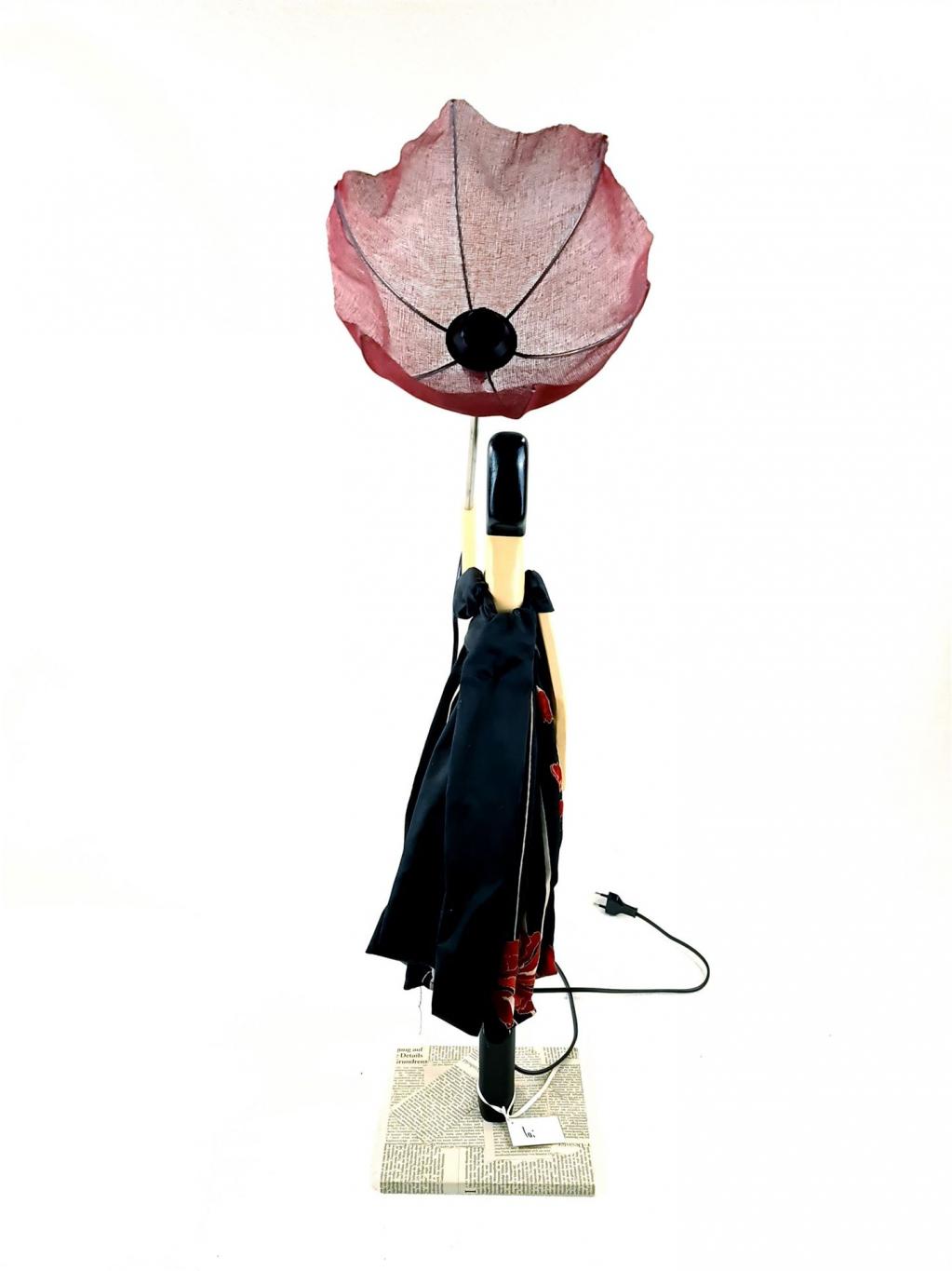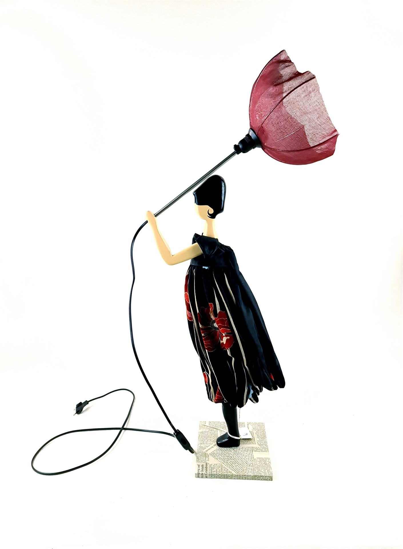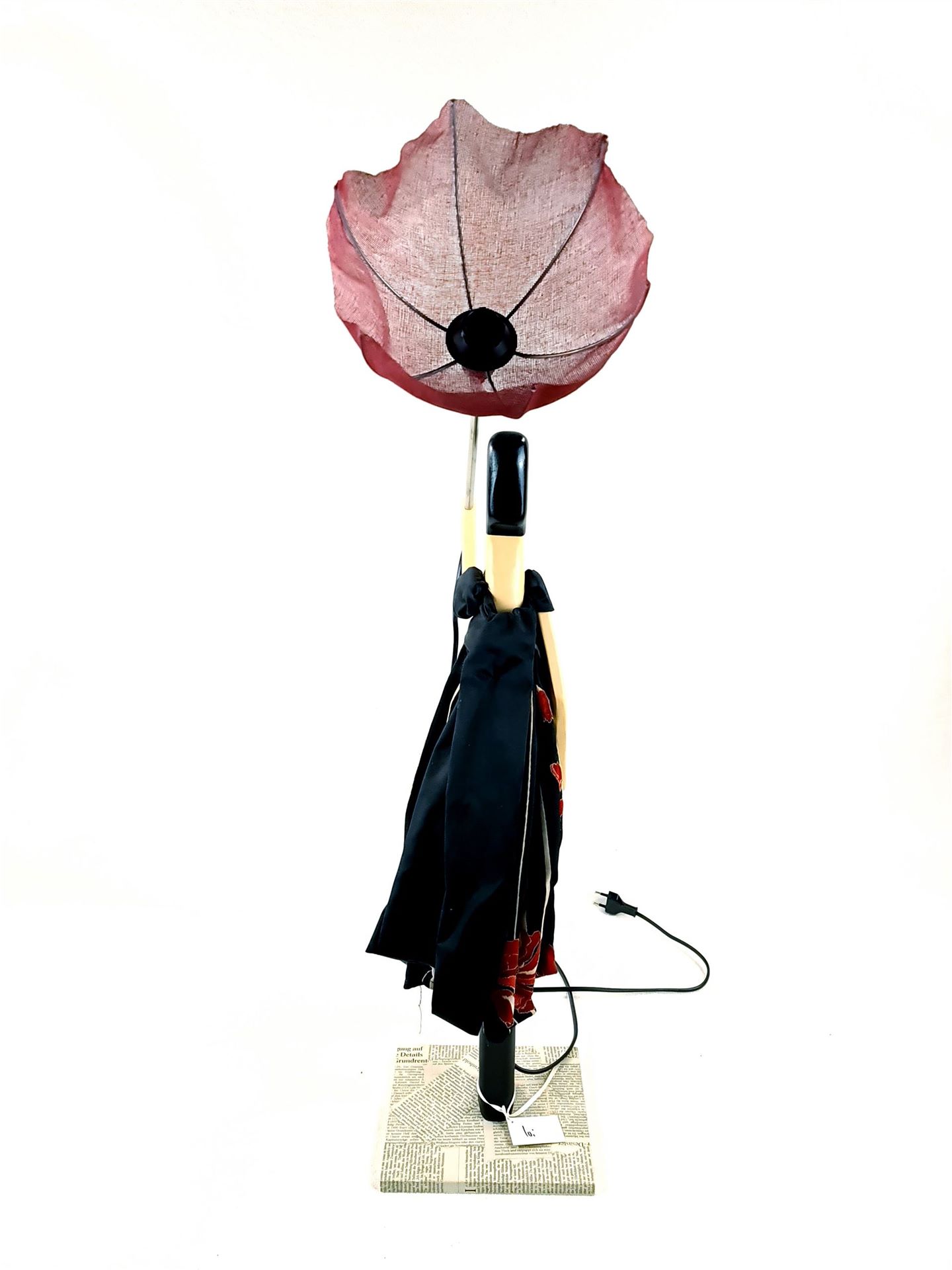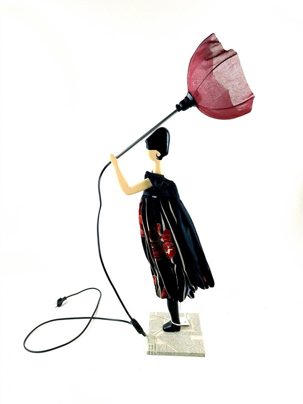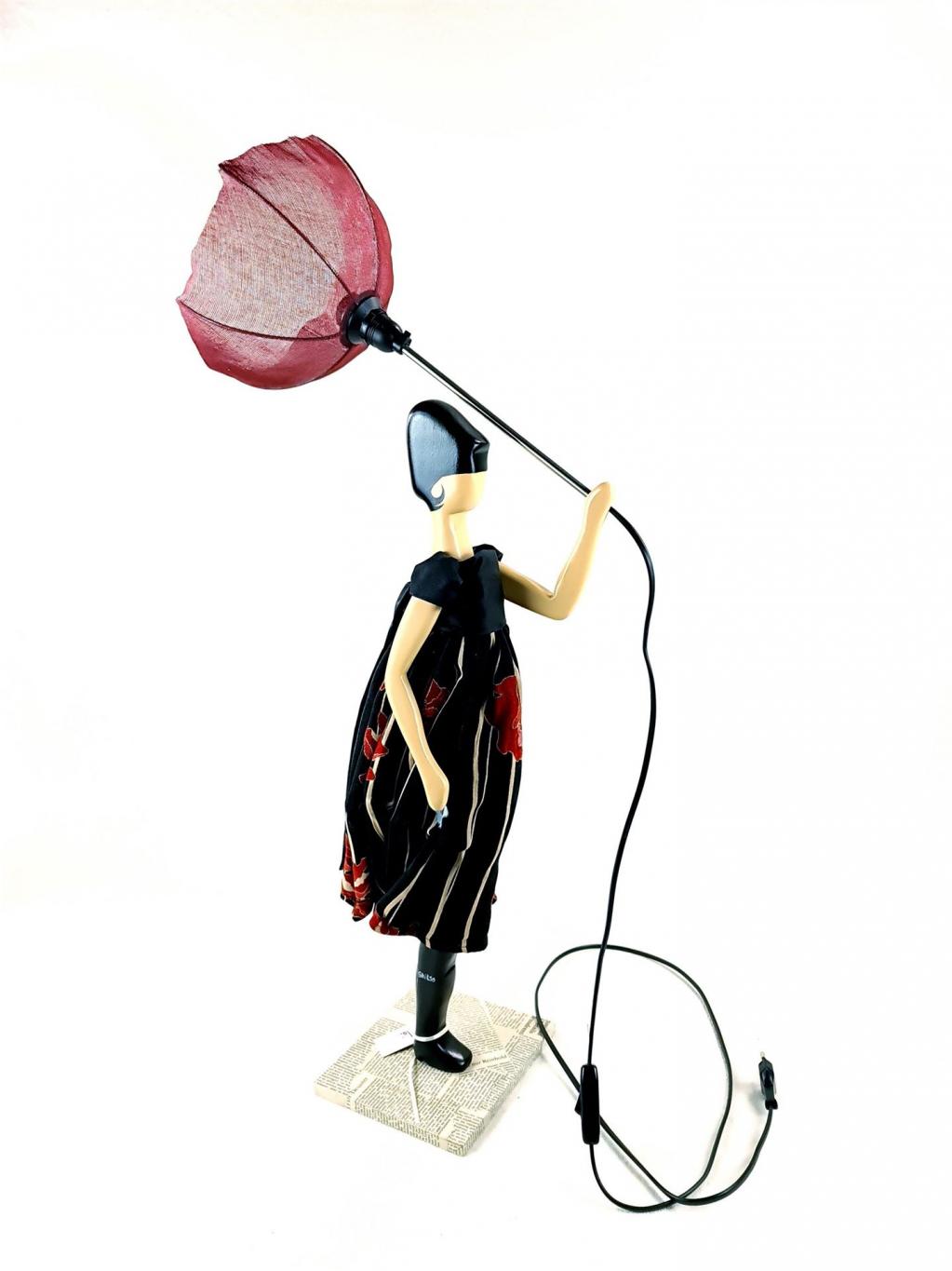 Tischlampe in Form einer Dame, die zu ihrem Kleidchen einen farblich abgestimmten geöffneten Sonnen-/Regen-Schirm trägt. Die Figur stellt den Lampenfuß dar, der Sonnen-/Regenschirm den Lampenschirm. Holzsockel mit eingefasstem Zeitungspapier. In Handarbeit gefertigt.