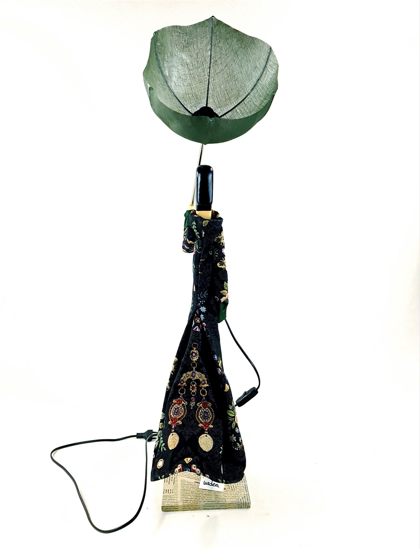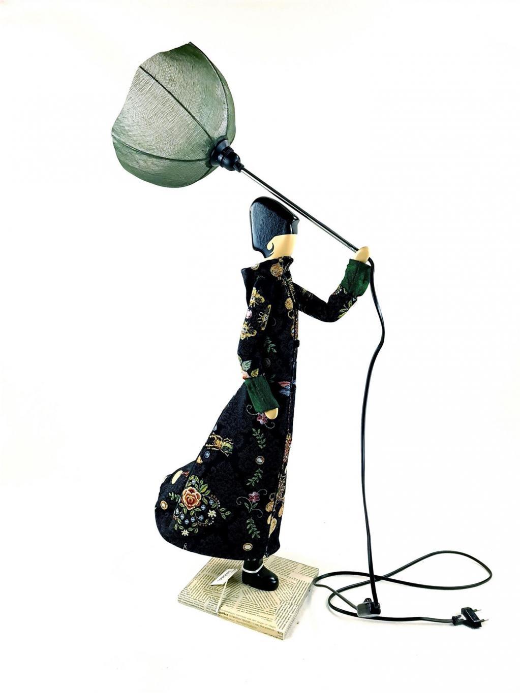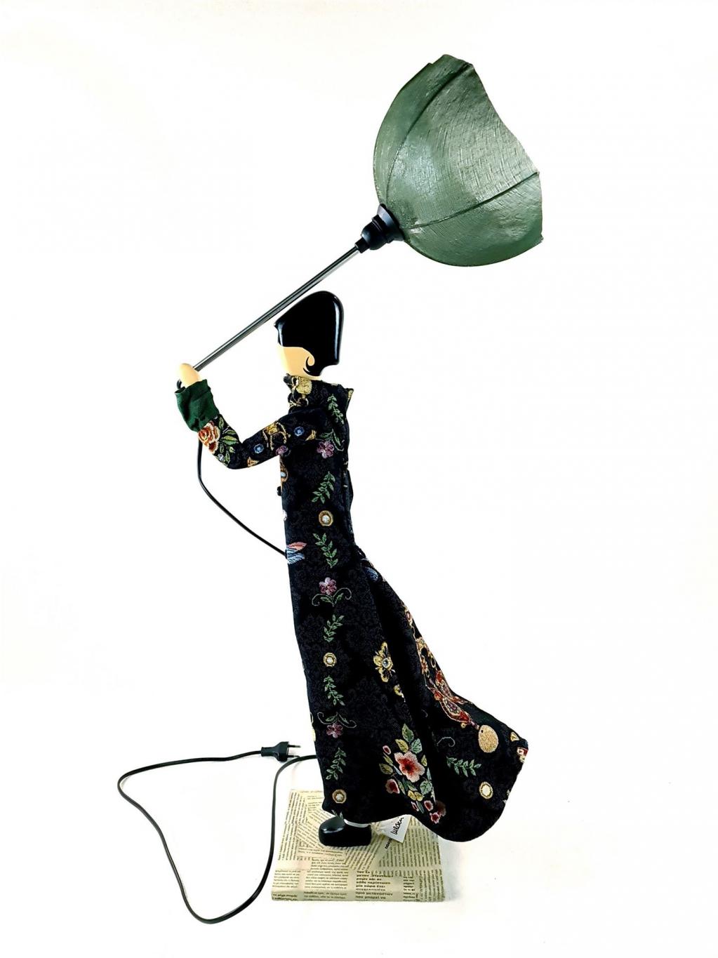 Tischlampe in Form einer Dame, die zu ihrem Kleidchen einen farblich abgestimmten geöffneten Sonnen-/Regen-Schirm trägt. Die Figur stellt den Lampenfuß dar, der Sonnen-/Regenschirm den Lampenschirm. Holzsockel mit eingefasstem Zeitungspapier. In Handarbeit gefertigt.