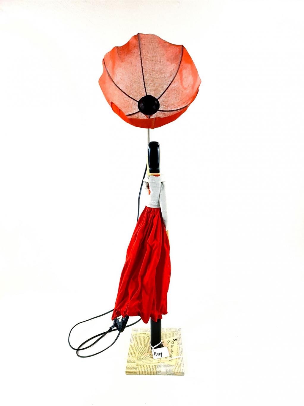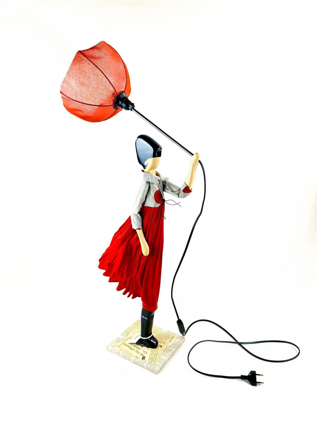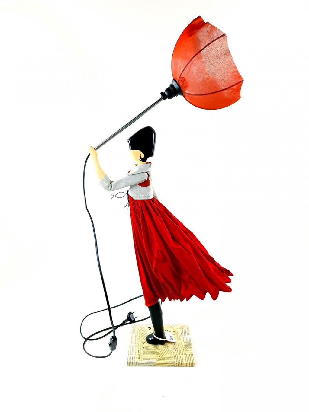 Tischlampe in Form einer Dame, die zu ihrem Kleidchen einen farblich abgestimmten geöffneten Sonnen-/Regen-Schirm trägt. Die Figur stellt den Lampenfuß dar, der Sonnen-/Regenschirm den Lampenschirm. Holzsockel mit eingefasstem Zeitungspapier. In Handarbeit gefertigt.