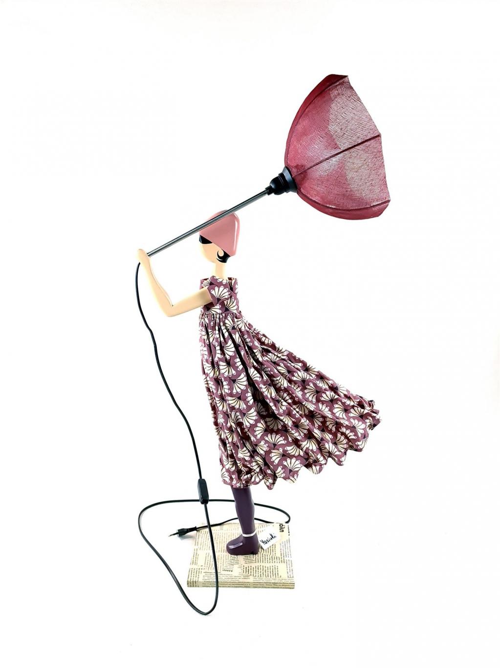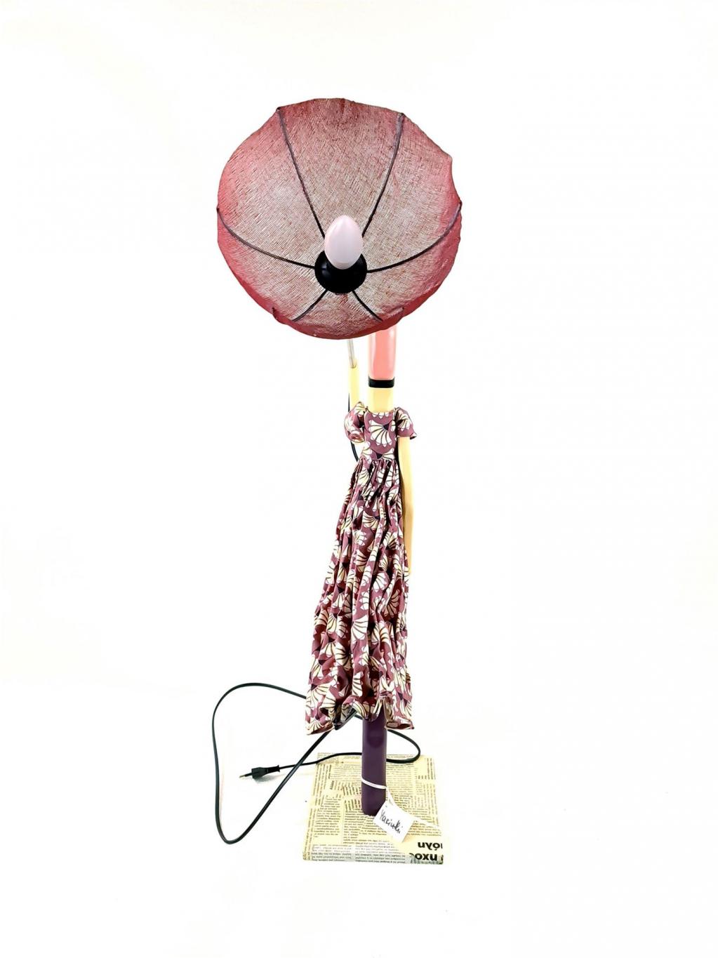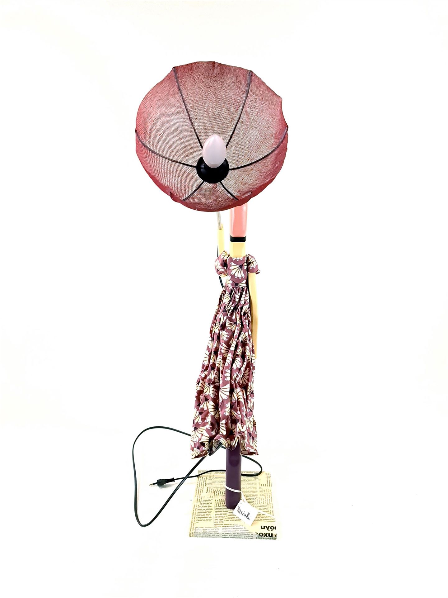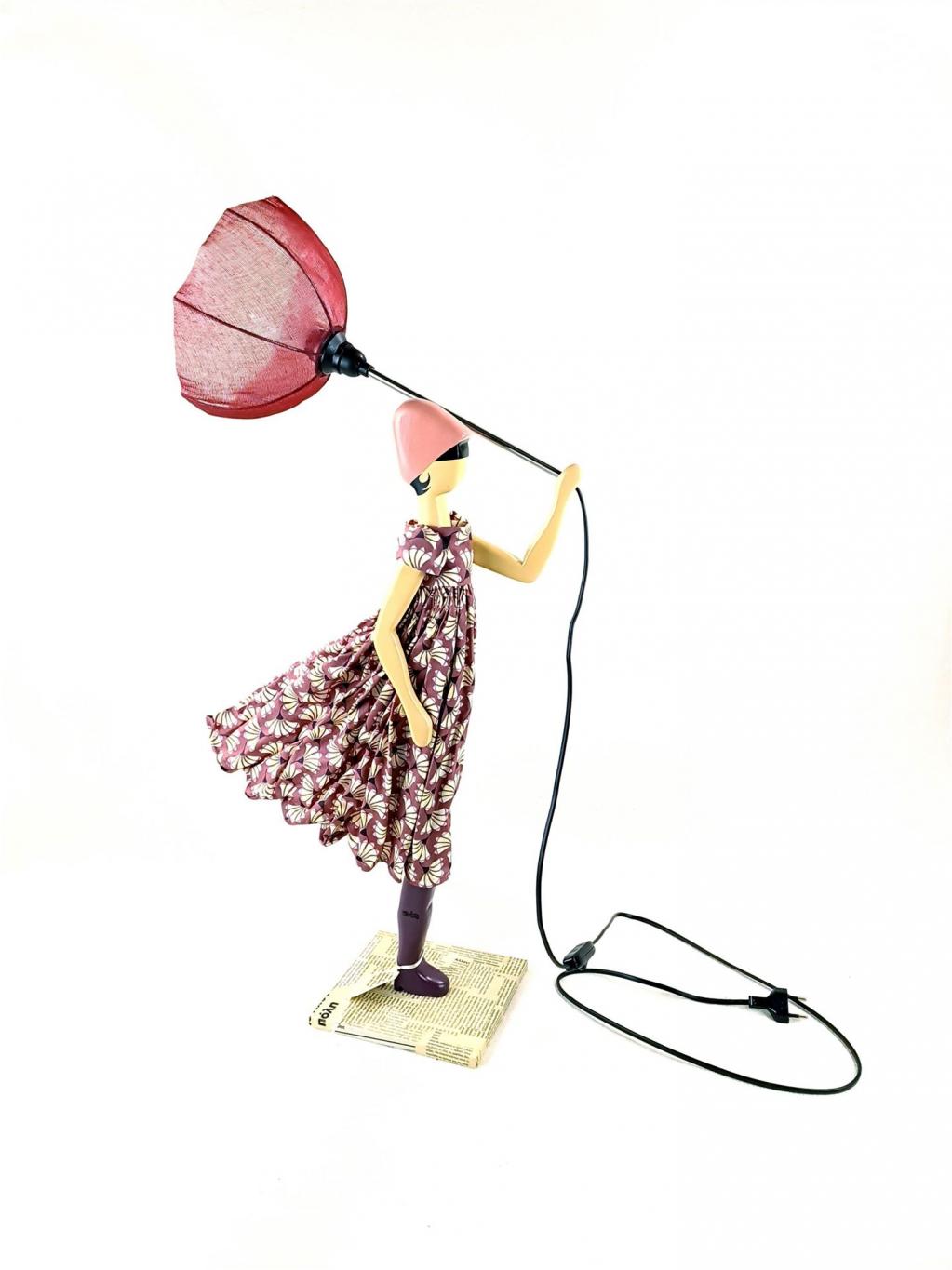 Tischlampe in Form einer Dame, die zu ihrem Kleidchen einen farblich abgestimmten geöffneten Sonnen-/Regen-Schirm trägt. Die Figur stellt den Lampenfuß dar, der Sonnen-/Regenschirm den Lampenschirm. Holzsockel mit eingefasstem Zeitungspapier. In Handarbeit gefertigt.