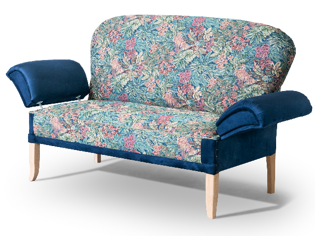 Küchensofa mit Sitzfläche auf Stuhlsitzhöhe. Sitzfläche mit Federkern, kräftig gepolsterte Rückenlehne und beidseitig klappbaren Armlehnen.