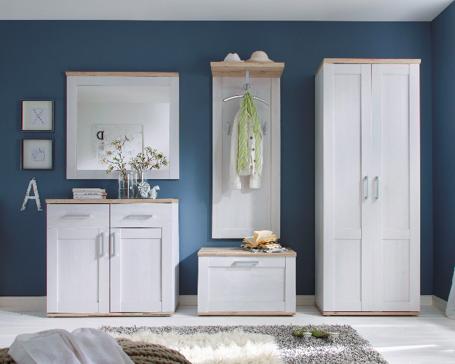 Garderobenprogramm bestehend aus Garderobenschrank, Garderobenpaneel, Garderobenspiegel, Schuhkommode und einer Bank mit Klappe.