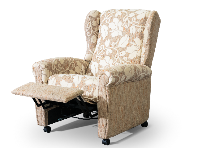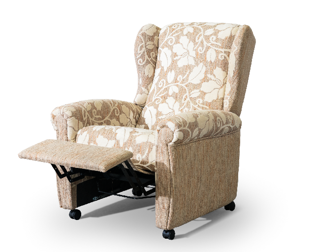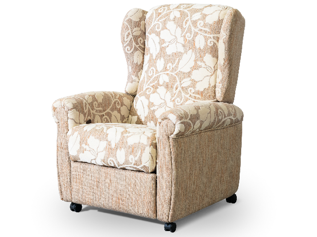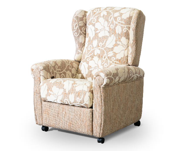 Bequemer Ohren-Fernsehsessel mit Federkernsitz und manuell ausklappbarem Fußteil und verstellbarer Rückenlehne. Polsterstoff: Velino beige geblümt